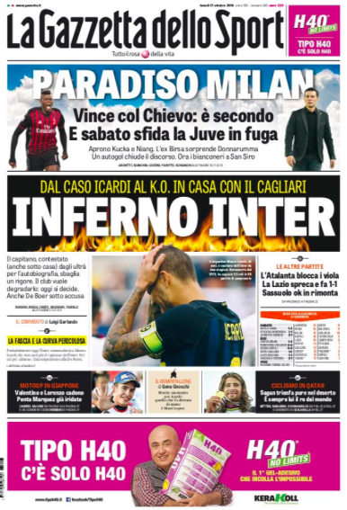 La Gazzetta dello Sport si sofferma sul dualismo delle due milanesi: Milan in paradiso, Inter all’inferno. E a San Siro sabato arriverà la Juventus, per un duello in vetta proprio contro i rossoneri di Montella.