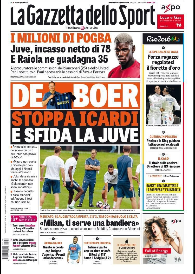‘De Boer stoppa Icardi e sfida la Juve’, è l’apertura della Gazzetta dello Sport che riprende le parole dell’allenatore olandese nella conferenza stampa di presentazione (“Mauro non parte. I bianconeri non sono imbattibili”). Stasera il debutto contro il Borussia Monchengladbach e prove di 4-2-3-1. In taglio alto si parla di Juventus e della cessione di Pogba, il cui incasso netto dei bianconeri – si legge – ammonta a 78 milioni. Raiola, invece, ne guadagna 35 tra commissioni di Juventus (25) e Manchester United.