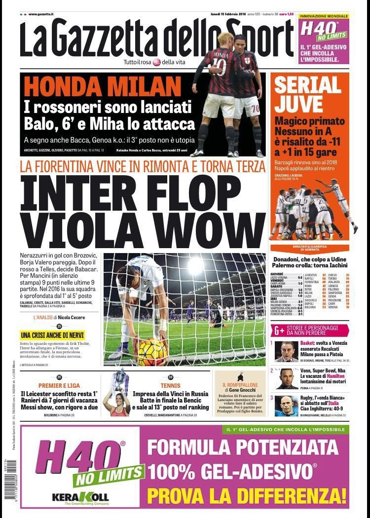 “Inter Flop Viola WOW”, è il titolo della Gazzetta dello Sport. I numeri della crisi nerazzurra dicono che nel 2016, l’Inter è scivolata dal primo al quinto posto, collezionando appena 9 punti in 9 partite. Si parla poi anche di Milan e dell’ottima prova di Honda. Ora, dunque, il terzo posto non è un’utopia per i rossoneri.