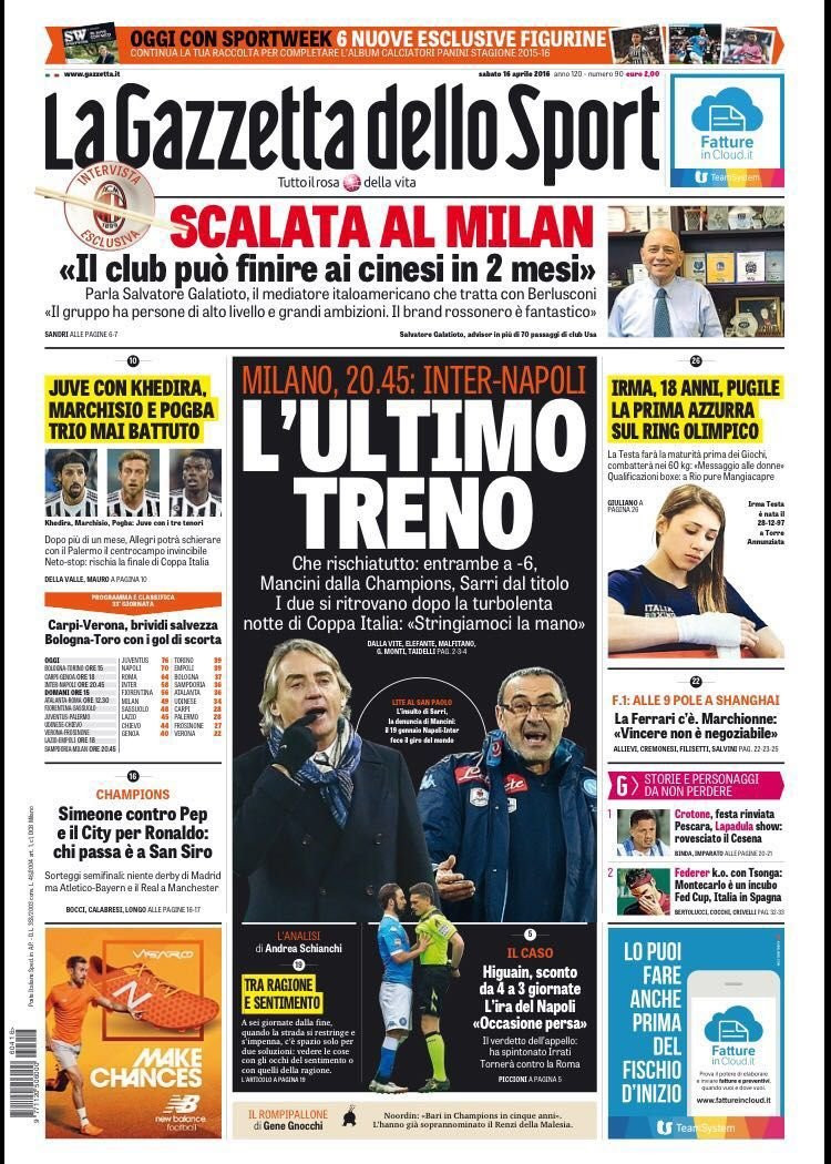 “L’ultimo treno” è il titolo della Gazzetta dello Sport in merito a Inter-Napoli, nel quale sia Mancini che Sarri si giocano ambizioni importanti: da una parte il terzo posto, dall’altra lo scudetto. I due si ritrovano dopo le polemiche nella sfida di Coppa Italia. Domenica toccherà alla Juventus con Allegri che ritrova il ‘trio magico’ e soprattutto mai battuto: dopo più di un mese, infatti, tornano dal 1′ insieme Khedira, Marchisio e Pogba.