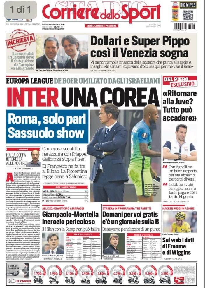Corriere dello Sport – Anche il Corriere si concentra sulla sconfitta dell’Inter: “Inter, una Corea”, con de Boer “umiliato dagli israeliani”. Poi le parole in esclusiva di Del Piero: “Ritornare alla Juve? Tutto può accadere” e un’inchiesta sul Venezia di Inzaghi: “Dollari e SuperPippo, così il Venezia sogna”.