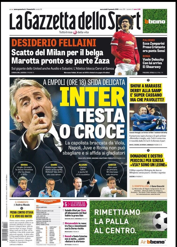 La Gazzetta dello Sport dedica la copertina a un urlante Roberto Mancini: “Inter, testa o croce. La capolista non può sbagliare”. Nella parte bassa della foto, in piccolo, i quattro colleghi contendenti dell’interista, anche loro alle prese con i propri calciatori. Nella spalla il commento al derby tra Genoa e Sampdoria, assieme all’introduzione a Milan-Bologna. Nel taglio alto si parla di mercato, con Fellaini al centro del triangolo Manchester United-Milan-Juventus.