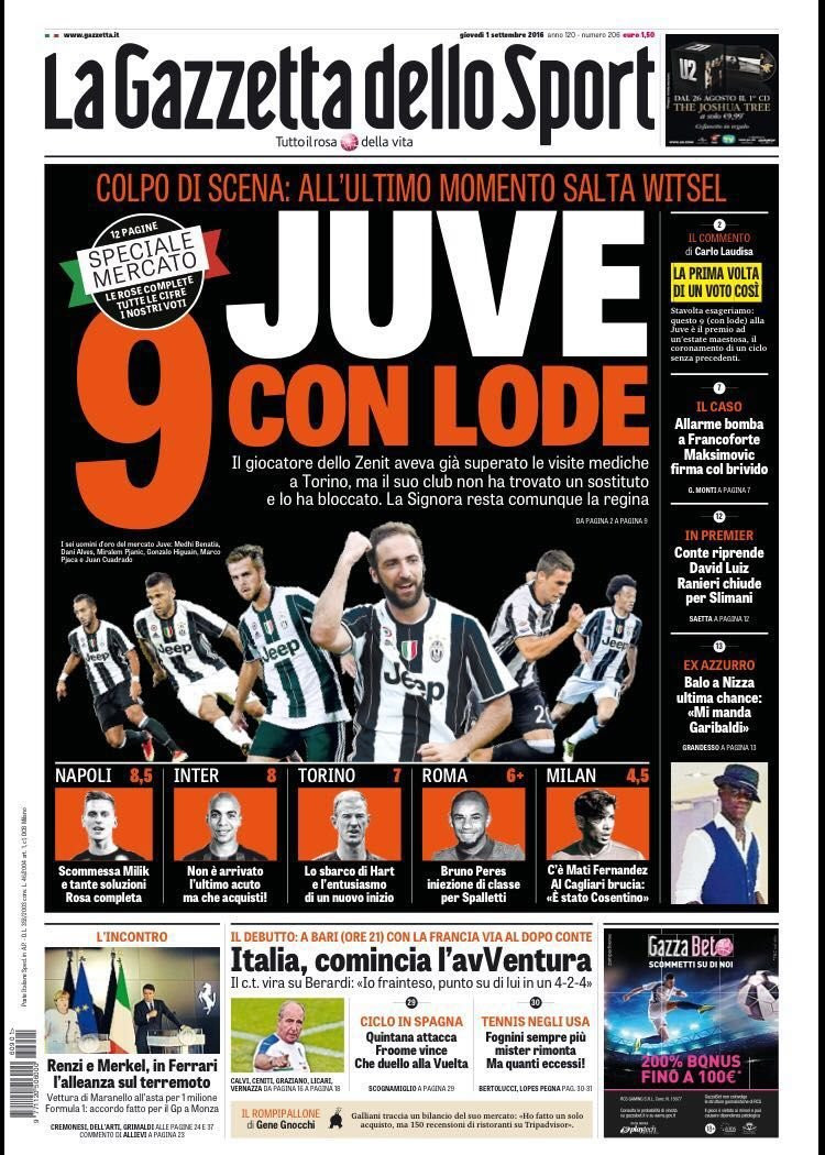 Gazzetta dello Sport – “Juve 9 con lode” è l’apertura della Gazzetta, che decide di dare i voti del mercato: Napoli 8,5, Inter 8, Torino 7, Roma 6+. Bocciato il Milan, che si prende un 4,5.