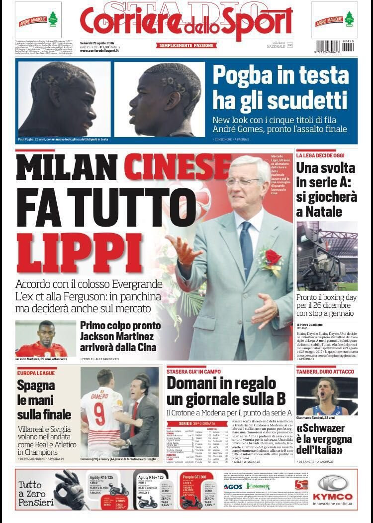 Corriere dello Sport – “Milan cinese: fa tutto Lippi“: il riferimento è al futuro del Milan, che secondo il CorSport si affiderà all’ex CT azzurro che arriverebbe a Milano con un ruolo alla Ferguson, ovvero sia quello di manager in panchina e con poteri sul mercato. Tutto questo in seguito all’accordo con il colosso cinese Evergrande. Annunciata anche una possibile svolta per la Serie A: il “boxing day” del 26 dicembre potrebbe sbarcare anche in Italia, con la sosta che slitterebbe a gennaio.