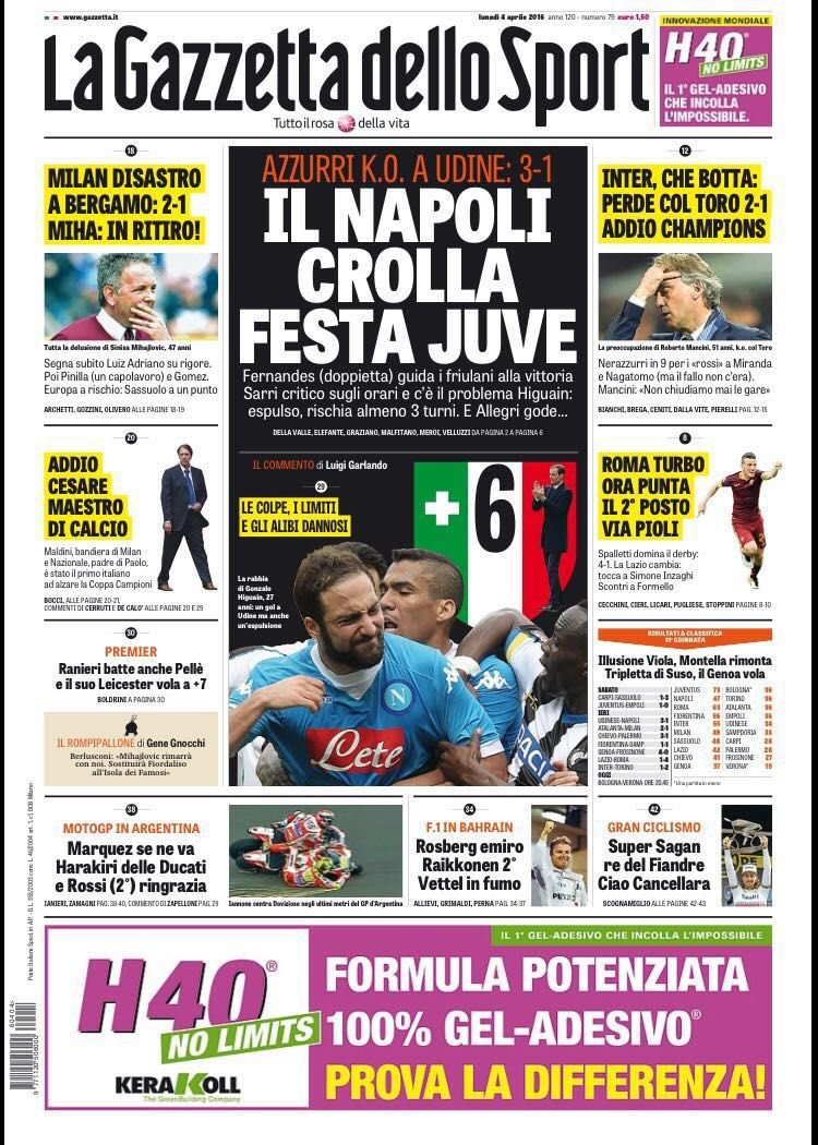 “Il Napoli crolla, festa Juve”, è l’apertura della prima pagine della Gazzetta dello Sport, che sottolinea la pesante sconfitta della squadra di Sarri ad Udine, consentendo alla Juve di scappare a 6 lunghezze. Spazio anche all’addio di Cesare Maldini, alle inaspettate sconfitte di Milan ed Inter ed, infine, al derby di Roma, terminato con l’esonero di Stefano Pioli.