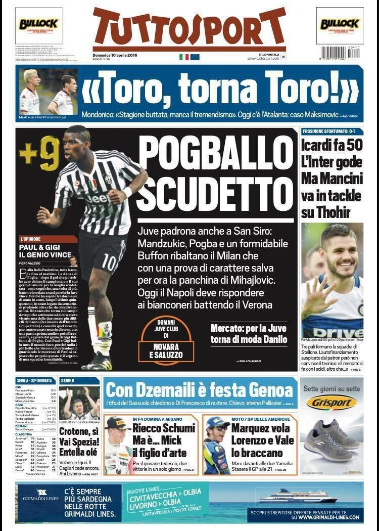 Tuttosport apre parlando della vittoria della Juventus a San Siro “Pogballo Scudetto”. Juventus ora a +9 dal Napoli, con una gara in più, dopo la rete di Pogba nell’1-2 contro il Milan. In taglio alto “Toro, torna Toro!”, dichiarazioni dell’ex Emiliano Mondonico. La trentaduesima giornata di Serie A ha già detto molto, ma mancano ancora sei partite, di cui cinque in programma quest’oggi. Da vivere, in attesa del mercato, sempre su Gianlucadimarzio.com.