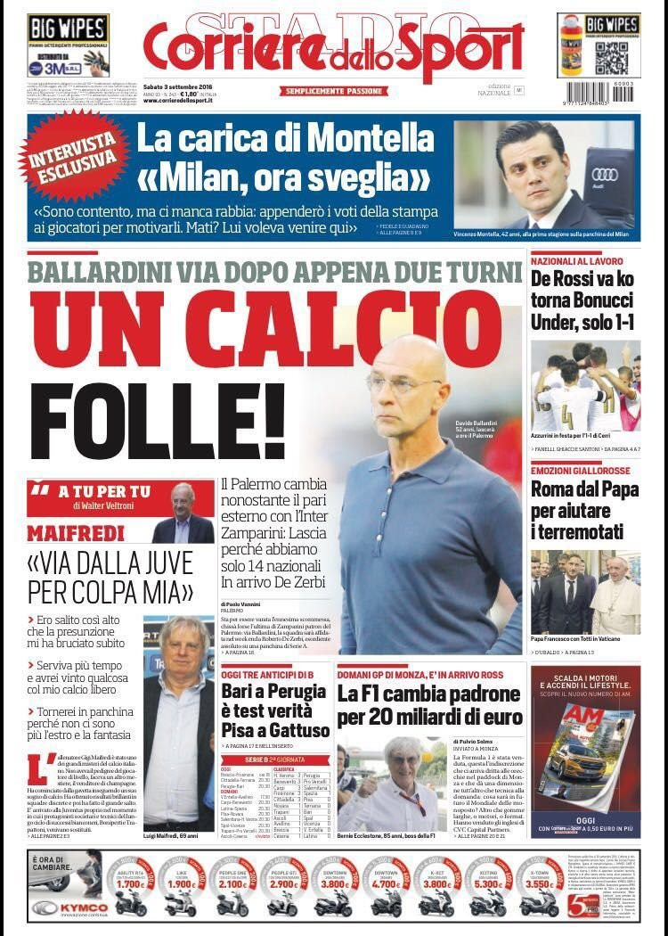 “Un calcio folle”, titola il Corriere dello Sport. Il riferimento a Ballardini e al suo addio alla panchina del Palermo dopo appena due giornate, pronto De Zerbi al suo posto. Taglio alto per il Milan, parla Montella, che chiede la svolta al suo Milan. Spazio anche per un’intervista a Maifredi, tra il rimpianto Juventus e la carriera da allenatore. Chiusura con la Roma, impegnata in amichevole contro il San Lorenzo del Papa con l’incasso devoluto ai terremotati del Centro Italia.