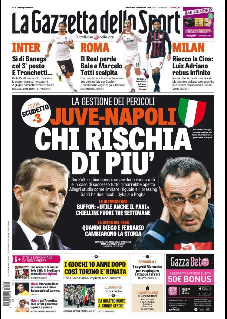 “Juve-Napoli chi rischia di più?” è l’apertura de La Gazzetta dello Sport. Bianconeri chiamati a vincere o non perdere per tenere il discorso aperto. Allegri studia le mosse per fermare Higuain, Sarri teme Pogba e Dybala.
