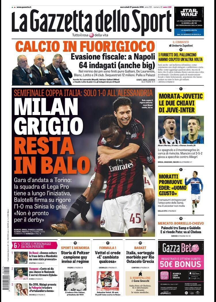 La Gazzetta dello Sport dedica il proprio titolo alla partita rossonera di Coppa Italia: “Milan grigio resta in Balo”. “Calcio in fuorigioco, evasione fiscale: a Napoli indagati in 64” l’apertura alta del quotidiano rosa parla invece delle presunte frodi di alcune squadre di Serie A.