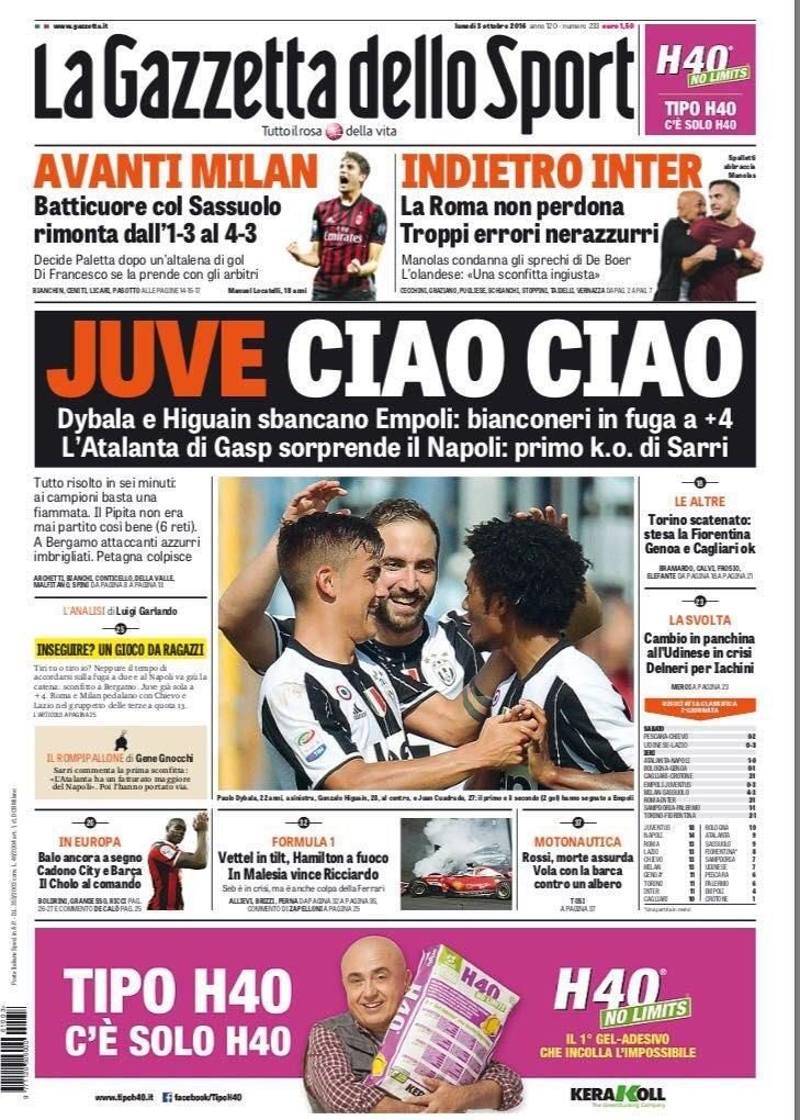 La ‘Gazzetta dello Sport’ dedica la propria prima pagina alla Juve, prima a + 4 dopo la sconfitta del Napoli a Bergamo: “Juve ciao ciao”. In alto spazio diviso tra Milan “Avanti Milan” ed Inter “Indietro Inter”: titolo motivato rispettivamente dalla vittoria sul Sassuolo per 4-3 e la sconfitta per 2-1 con la Roma. In spalla, poi: “Torino scatenato: stesa la Fiorentina. Genoa e Cagliari ok” e “Cambio in panchina all’Udinese in crisi: Delneri per Iachini“. Infine, il calcio europeo: “Balo ancora a segno. Cadono City e Barça. Cholo al comando”.