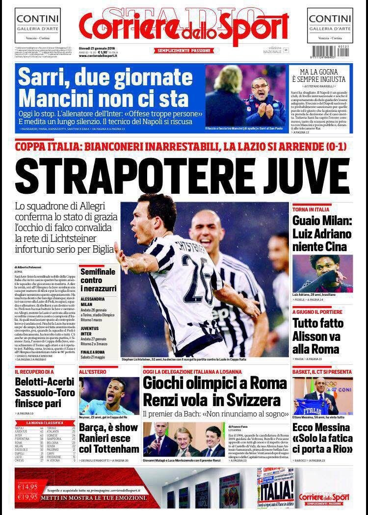 “Strapotere Juve“, questa l’apertura del Corriere dello Sport. In primo piano la partita andata in scena all’Olimpico, dove la Juve si è guadagnata la semifinale di Tim Cup grazie alla vittoria sulla Lazio. Spazio anche per la squalifica inflitta a Sarri e la rabbia di Mancini. Poi tanto mercato, il recupero di campionato tra Sassuolo e Torino e Renzi che vola in Svizzera per il sogno legato ai Giochi olimpici.