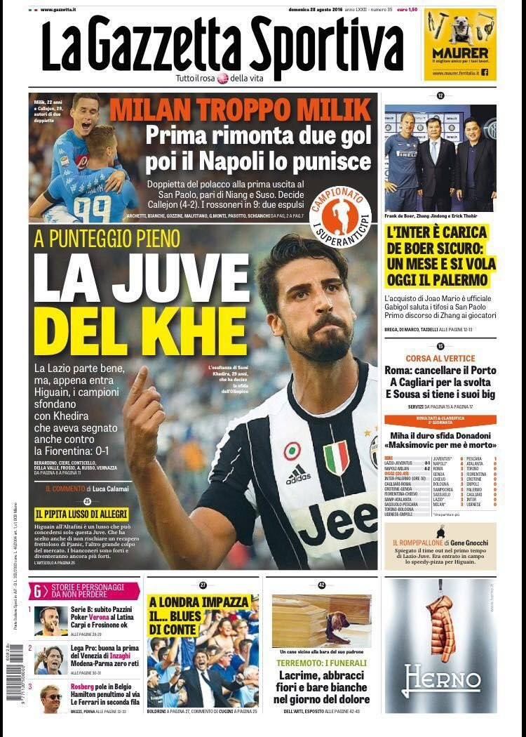 “La Juve del Khe” è l’apertura della Gazzetta dello Sport che esalta la prova del tedesco contro la Lazio. La Lazio parte bene, ma appena entra Higuain sfondano con Khedira. “Milan troppo Milik” è invece il titolo per la vittoria 4-2 del Napoli sui rossoneri. Un Milan che prima rimonta due gol poi il Napoli lo punisce. Di spalla invece c’è l’Inter. “De Boer è sicuro: un mese e si vola”. L’acquisto di Joao Mario è ufficiale e Gabigol saluta i tifosi del Santos.