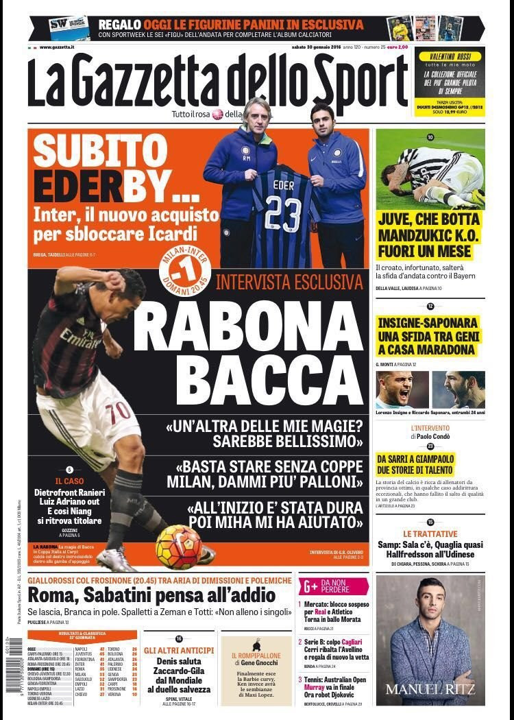 Derby della Madonnina che occupa quasi tutta la prima pagina della Gazzetta dello Sport con la sfida Bacca–Eder tutta da vivere. L’ex attaccante della Sampdoria, arrivato proprio in giornata a Milano, scalpita per vivere da subito “l’Ederby”, mentre il colombiano sogna la ‘Rabona’ per stendere i nerazzurri. In spalla, mastica amaro la Juve che perde Mandzukic per un mese.
