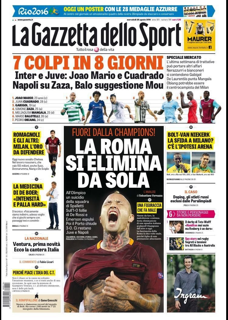 ‘La Gazzetta dello Sport’, apre così la propria prima pagina: “La Roma si elimina da sola”, senza lasciare spazio ad ulteriori commenti. Al mercato è dedicato il trafiletto in alto: “7 colpi in 8 giorni”, tra Joao Mario, Cuadrado, Zaza e non solo. Poi, le novità di Ventura per quanto riguarda la Nazionale, la ‘Medicina di De Boer’ e l’oro da difendere per il Milan, tra Romagnoli e gli altri giovani talenti rossoneri.