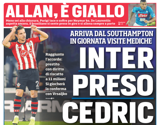 Calciomercato ancora grande protagonista nelle prime pagine dei giornali in edicola. “La strada per Barella” titola La Gazzetta dello Sport, che parla dell’Inter e della strategia per arrivare a giugno al gioiello del Cagliari. In altro la presentazione di Piatek: “Sono nato pronto”. Il Corriere dello Sport apre con il nuovo rinforzo nerazzurro: “Inter, preso Cedric. Arriva dal Saputhampton, in giornata visite mediche”; nel taglio alto: “Allan, è giallo”; poi in basso ancora mercato: “Lazio, addio a Lukaku: va al Newcastle”; “Christensen, è Juve. Monaco su Benatia”; “Sturaro e Schafer al Genoa, Jesé a Parma”.