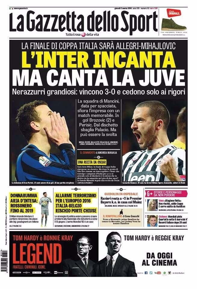 La Gazzetta dello Sport gioca con le parole nel titolo d’apertura: “L’Inter incanta ma canta la Juve”. Allegri vs Mihajlovic in finale, ma che sofferenza: “nerazzurri grandiosi, cedono solo ai rigori”. Il Milan blinda Donnarumma: con il portierino “aria d’intesa: rossonero fino al 2019″. Spazio anche per l’allarme terrorismo che aleggia sugli Europei: Italia-Belgio è a rischio porte chiuse”.