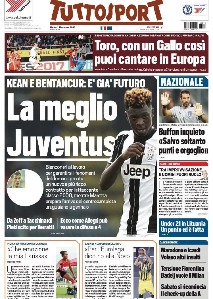 “La meglio Juventus” titola infine Tuttosport soffermandosi sul mercato della Juventus, al lavoro per garantirsi i fenomeni del domani: per Kean è pronto il rinnovo e Marotta prepara anche l’arrivo di Bentancur per gennaio. Si parla anche di Nazionale con le parole di Buffon dopo la vittoria sofferta contro la Macedonia: “Salvo soltanto punti e orgoglio”. In taglio alto spazio al Torino, che ‘con un Gallo così può cantare anche in Europa”.