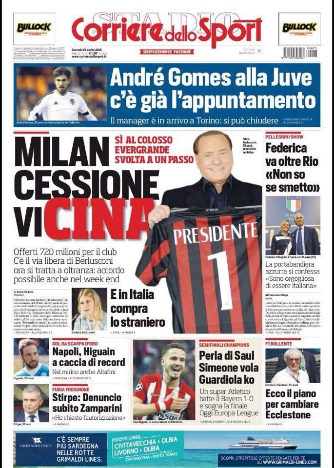 “Che fai Silvio vendi o rilanci?” è l’apertura de La Gazzetta dello Sport. Berlusconi tratta la cessione del Milan ai cinesi: offerta di 700 milioni di euro, gli asiatici vogliono una risposta in tempi brevi. Tra gli acquirenti giganti come Jack Ma (Alibaba) e Li Ka Shing (HWL). Attesa per oggi l’assemblea dei soci del club rossonero.