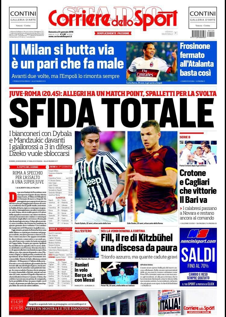 Una giornata intensa, tra campo e calciomercato. Continuano le trattative e torna anche la Serie A: due pareggi, senza reti tra Frosinone e Atalanta, più emozionante quello tra Empoli e Milan, con i rossoneri che si fanno raggiungere due volte. Di questo e di molto altro si parla nelle prime pagine dei principali quotidiani sportivi italiani. La Gazzetta dello Sport titola “Milan che spreco”, sottolineando qualche errore di troppo dei rossoneri. C’è anche Juve-Roma, con Allegri che deve fare attenzione agli “scherzetti di Spalletti”. L’Inter “sfida” San Siro e il Carpi, mentre gli amici Insigne e Cassano si affrontano in un match che per il Napoli vale il primato. “Sfida totale”: questo è Juve-Roma secondo il Corriere dello Sport. Per i bianconeri è un “matchpoint”, per i giallorossi potrebbe essere “la svolta”. Spazio anche per la Serie B, con le vittorie di Crotone e Cagliari. Infine Tuttosport, che titola “Fatelo per loro” in riferimento ai tifosi juventini che vivono a Roma, un elemento che non fa che aumentare l’importanza di questa partita. Un’esortazione anche per il Torino: “Diventa grande”, mentre il Milan “non decolla”. E’ tutto anche per oggi: domani sarà un’altra giornata piena di calcio e notizie, da leggere e commentare qui, su GianlucaDiMarzio.com.