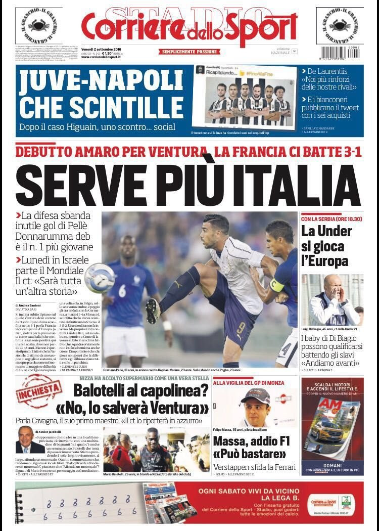 Il Corriere dello Sport titola: “Serve più Italia”: debutto amaro per Giampiero Ventura e la Francia ci batte 3-1. In taglio alto: “Juve-Napoli che scintille”. Dopo il caso Higuain, uno scontro social tra i due club. Non solo Nazionale, spazio anche all’Under 21 di scena alle 18:30 contro la Serbia: “I baby di Di Biagio possono qualificarsi battendo gli slavi”.