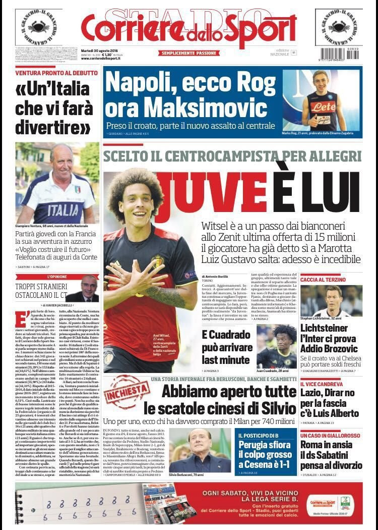 “Juve è lui” è il titolo del Corriere dello Sport, in riferimento a Witsel scelto dalla Juve come rinforzo per Allegri. Taglio alto dedicato al Napoli: “Ecco Rog, ora Maksimovic”, sottolineando come nelle prossime 48 ore possa partire il nuovo assalto al centrale del Torino. E poi ancora mercato con “Lichtsteiner l’Inter ci prova” e “Addio Brozovic”. Mentre in casa bianconera “Cuadrado può arrivare last minute”.
