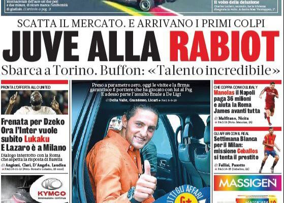Il passaggio di Manolas al Napoli e le ultime sulle altre trattative di calciomercato. La Spagna di Fabian Ruiz, regina all'Europeo Under 21, e l'arrivo di Rabiot a Torino: sono questi i temi principalmente trattati dalle prime pagine dei quotidiani sportivi oggi in edicola.