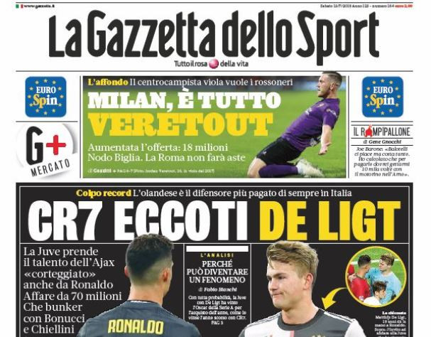 Il mercato in primo piano, con la trattativa fra Juventus e d Ajax ormai giunta verso la conclusione. Per vedere De Ligt in bianconero manca davvero poco e intanto Ronaldo fa ritorno a Torino, dove inizierà ad allenarsi agli ordini di Sarri. Spazio anche al primo abbraccio fra Barella e Conte, con il centrocampista classe 1997 diventato ufficialmente un nuovo giocatore nerazzurro. SCORRERE LA GALLERY IN ALTO PER SFOGLIARE LE PRIME PAGINE DEI PRINCIPALI QUOTIDIANI SPORTIVI OGGI IN EDICOLA
