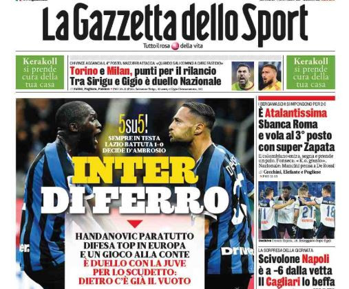 Dalla vittoria dell'Inter di Conte sulla Lazio che vale il primato in classifica agli altri successi esterni di Atalanta e Cagliari, rispettivamente contro Roma e Napoli. Questo e molto altro sulle prime pagine dei quotidiani sportivi in edicola oggi 26 settembre 2019.