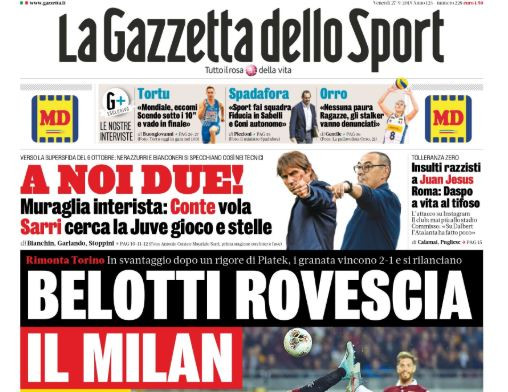 Belotti segna, il Milan cade. Termina con la doppietta del Gallo la quinta giornata di Serie A, che ha visto i rossoneri ancora sconfitti. Zero punti che ora fanno male, come riporta il Corriere dello Sport. La vittoria del Torino e il mercato della Juventus, questi i temi principali toccati dai quotidiani sportivi.