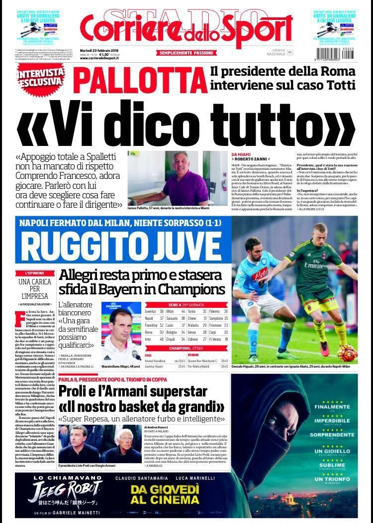 Il Corriere dello Sport apre con l’intervista a James Pallotta sul caso Totti: “Appoggio totale a Spalletti, non ha mancato di rispetto. Comprendo Francesco, adora giocare. Parlerò con lui ora deve scegliere cosa fare, se continuare o fare il dirigente”, le parole del presidente giallorosso. Si parla poi di “Ruggito Juve” per l’importante sfida di questa sera.