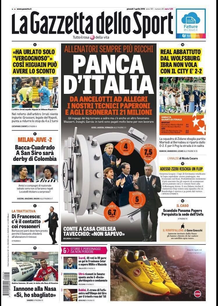 “Panca d’Italia” è l’apertura de La Gazzetta dello Sport. Indagine sugli ingaggi degli allenatori italiani: Ancelotti, Allegri, Conte e Mancini i più pagati. C’è però chi, come Garcia, Inzaghi o Mazzarri, guadagna bene senza lavorare.