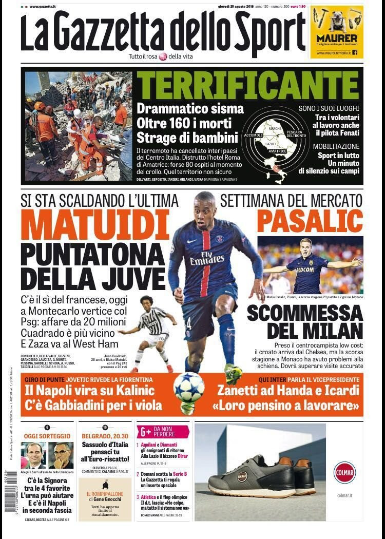 Un altro giorno se ne va, ma prima è tempo della rassegna dei quotidiani sportivi. Oltre alle drammatiche notizie sul terremoto che ha colpito il centro Italia, anche pillole sul mercato.