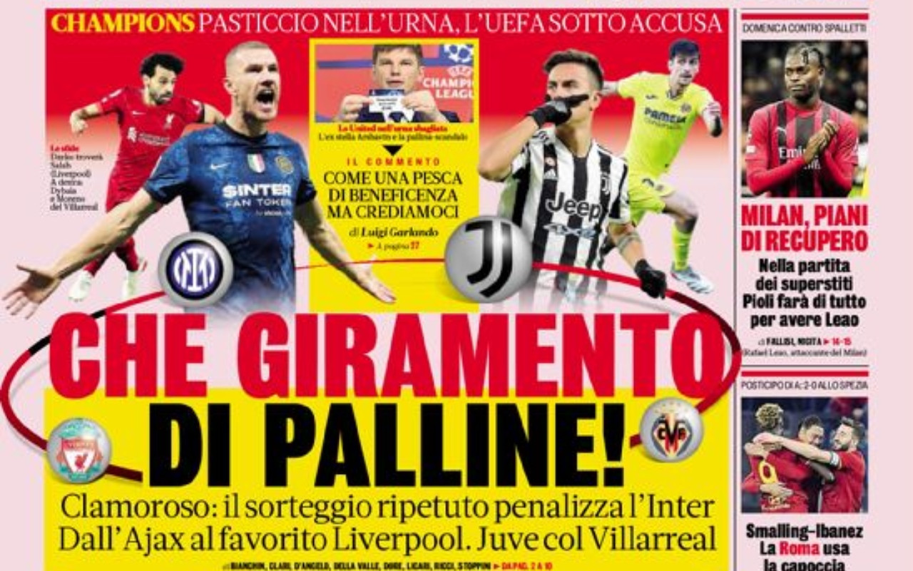 I sorteggi di Champions, Europa League e Conference League, oltre alla vittoria della Roma contro lo Spezia nell’ultima gara della 17a giornata di Serie A. Questi i temi principali sui giornali in edicola martedì 14 dicembre 2021.