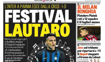 Nella Prima Pagina della Gazzetta dello Sport l’apertura è dedicata a Lautaro Martinez: il suo gol regala la vittoria e interromper il digiuno dell’Inter, che durava dal 29 dicembre scorso, contro il Parma: “Festival Lautaro”. In apertura spazio anche al Milan e alla Juve impegnate quest’oggi in campionato e a Lafont che “stoppa” il Napoli.