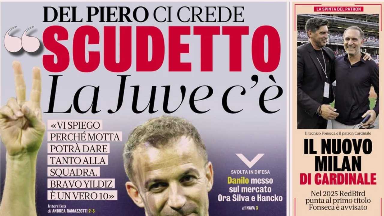 La Gazzetta dello Sport apre sulle Parole di Alessandro Del Piero dai Globe Soccer Awards, oltre che della battaglia scudetto tra Inter e Atalanta.