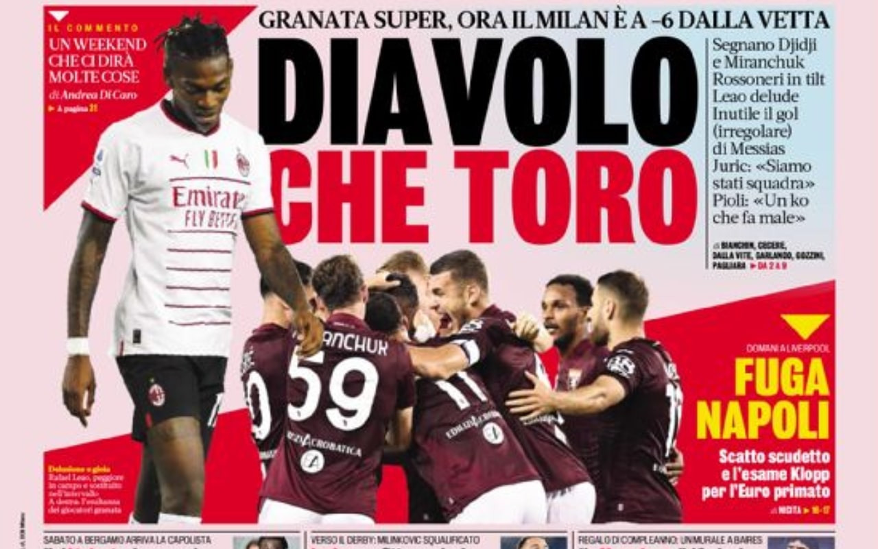 Il Milan perde a Torino e ora è a meno sei dal Napoli capolista. La sconfitta della squadra rossonera occupa ampio spazio sui quotidiani sportivi, così come il primo tentativo di fuga da parte della squadra di Luciano Spalletti.