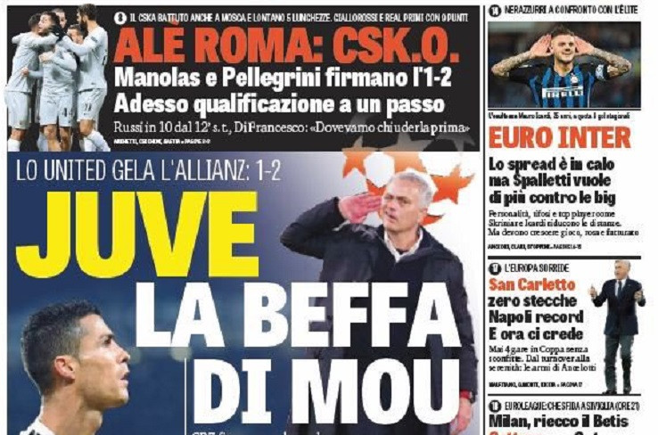 “Juve, la beffa di Mou”. Questa l’apertura della Gazzetta dello Sport dopo la rimonta del Manchester United in casa della Juventus. Bianconeri al primo ko stagionale. “Alé Roma, CSK.O”, in taglio alto, è il titolo sui giallorossi, unica italiana a vincere nella quarta, difficilissima, giornata di Champions League.