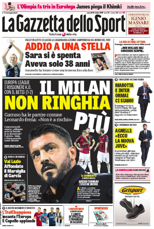 Il Corriere dello Sport titola in prima pagina “Non ringhia più”, riferendosi al ko del Milan in casa contro il Betis: “Squadra ancora stordita dal derby, gli spagnoli passeggiano. Il tecnico amaro dice: ‘Giusto mettermi in discussione’”. Poi anche le parole di Donadoni, mentre in taglio alto si torna sulle dichiarazioni di Agnelli: “Biglietti, striscioni, inchieste: il contrattacco del presidente all’assemblea degli azionisti”. Di spalla “una Lazio da favola” e la tripletta del Chelsea, mentre il Siviglia ne segna sei. In taglio basso anche la Roma con “mezza Europa che cerca Under” e “il giovane Zhang che si prende l’Inter“. Poi anche la B a 22 squadre ed è “scontro totale”.