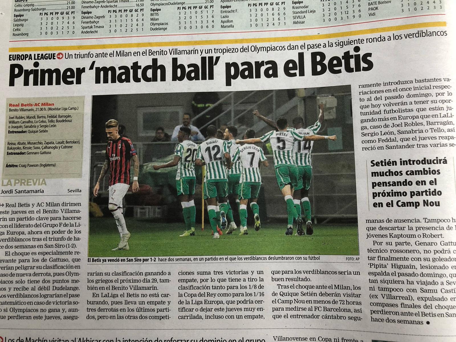 Per AS, “Betis e Milan mettono sotto esame i propri dubbi al Benito Villamarín”: la squadra di Setién è chiamata ad una reazione dopo il difficile periodo vissuto in Liga, il Milan a dare invece continuità dopo le 3 vittorie consecutive in campionato.