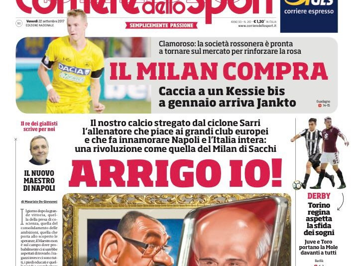 Il Corriere dello Sport titola: “CR…5 domande”, riferendosi appunto al caso Ronaldo. In taglio alto, spazio al derby di mercato per Barella: “Inter e Milan sul talento del Cagliari: è derby”. Un anticipo del derby vero e proprio, che si giocherà al rientro dalla sosta.