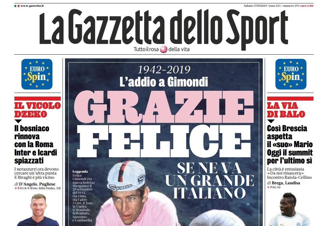 Tanto mercato sulle prime pagine questa mattina in edicola. In primo piano il rinnovo di Dzeko, che resta così alla Roma. A questo punto resta da capire il futuro di Icardi, comunque in uscita dall'Inter. Potrebbe essere alla Juventus o al Napoli, con gli azzurri che non mollano James Rodriguez nonostante le parole di Zidane alla vigilia dell'esordio in Liga. Spazio, ovviamente, a Felice Gimondi, tragicamente scomparso in seguito ad un malore in spiaggia. SFOGLIA LA NOSTRA GALLERY