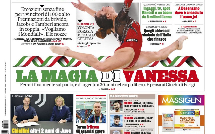 E’ sempre il calciomercato ad essere protagonista anche sulle prime pagine dei giornali in edicola oggi. Dal futuro di Lukaku, sempre più nei pensieri del Chelsea, a quello già deciso di Chiellini, fresco di rinnovo con la Juventus. Proprio in bianconero arriva Kaio Jorge: il suo arrivo alla Juventus è stato ufficializzato dal Santos. Spazio anche alle Olimpiadi e alla medaglia d’argento di Vanessa Ferrari.