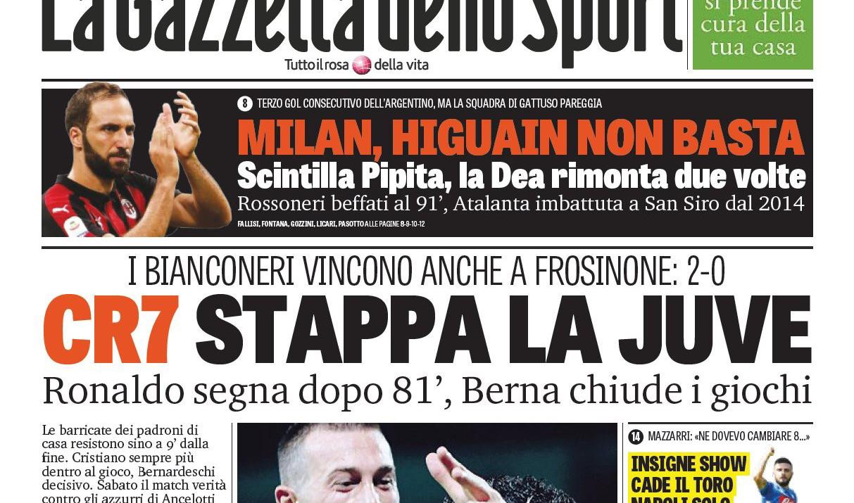 “Ronaldo stappa la Juve” è il titolo centrale de La Gazzetta dello Sport, che aggiunge “Insigne show, cade il Toro. Napoli solo al secondo posto”, “Milan, Higuain non basta” e “Crisi Roma: a Bologna DiFra crolla: tutti in ritiro”.