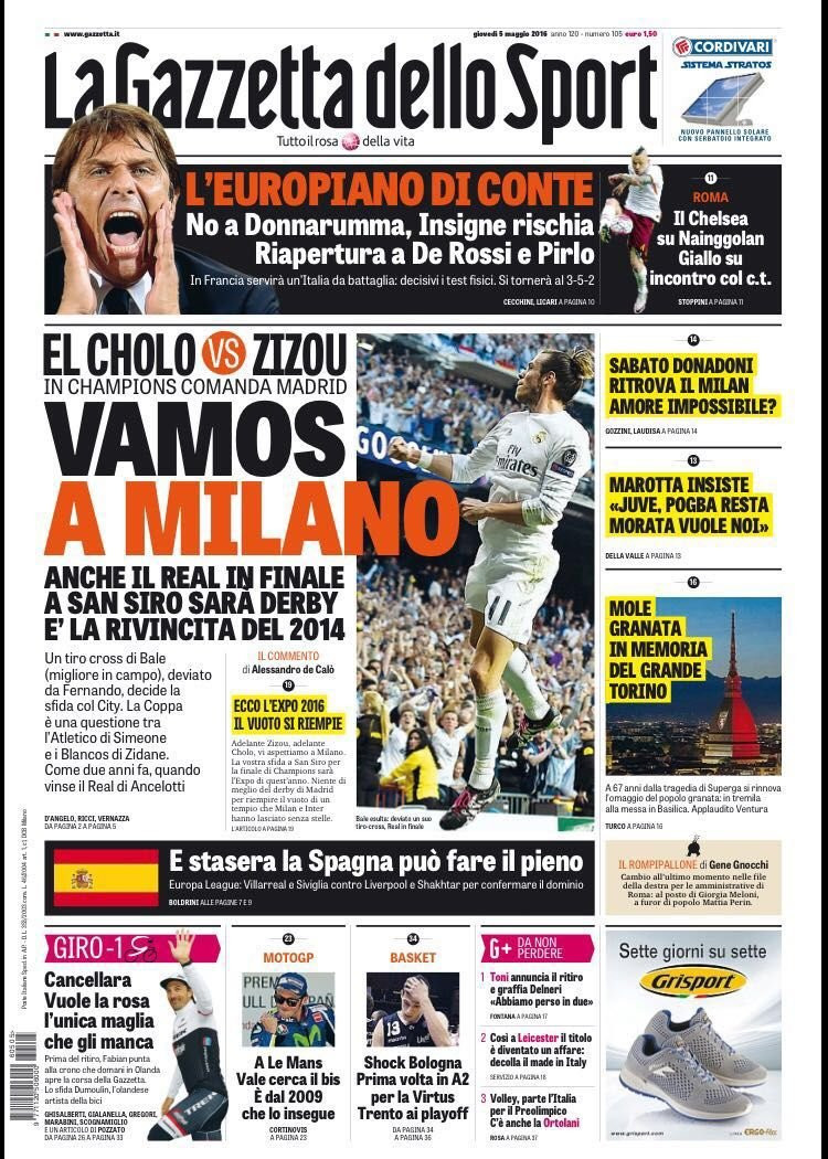 “Conte-Nainggolan, che intrigo!” titola il Corriere dello Sport, con in primo piano l’incontro tra il futuro allenatore del Chelsea ed il centrocampista della Roma, momentaneamente smentito. Taglio alto dedicato invece al successo merengue in semifinale di Champions League, con la possibilità di alzare l”Undécima” coppa dalle grandi orecchie per la squadra di Zidane (“A Milano lo show tra Real e Atlético“).