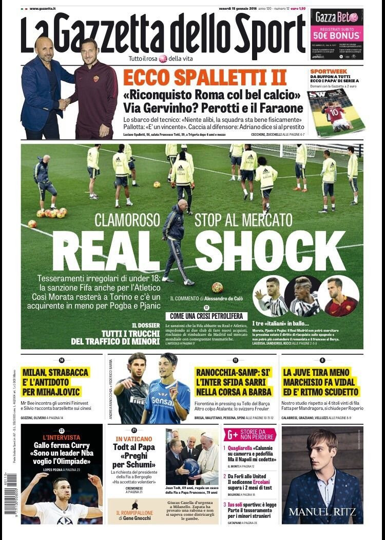 Le irregolarità della società di Florentino Perez campeggiano anche sulla prima della Gazzetta dello Sport che sottolinea il “Real Shock” subìto da Zidane che deve rinunciare alla tentazione Pjanic.In alto “Ecco Spalletti II”, comincia la nuova avventura per l’allenatore di Certaldo sulla panchina della Roma, così come comincia una nuova giornata di calciomercato piena di emozioni e sorprese, da vivere ovviamente sempre qui, su GianlucadiMarzio.com