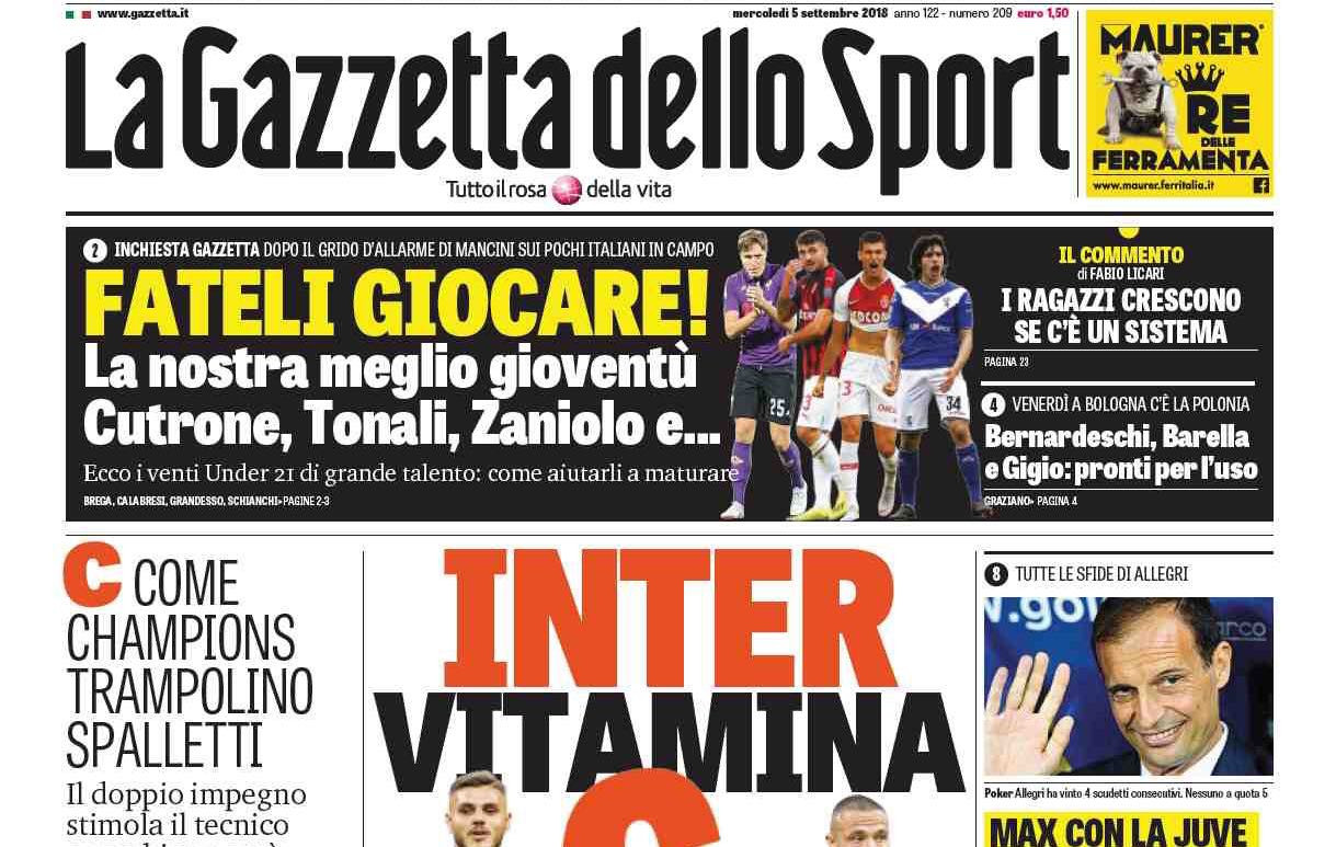 “Inter vitamina C” titola La Gazzetta dello Sport, individuando la Champions League come trampolino della squadra di Spalletti. Poi “Fateli giocare!”, “Max con la Juve è già da record”, “Berlusconi vuole il Monza” “Milan, Higuain lavoro e fatica”