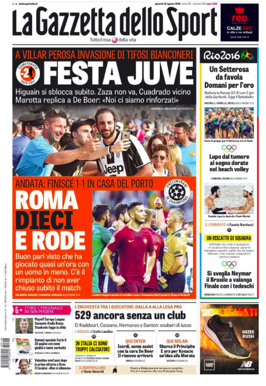 “Grasso a chi?” e spazio centrale dedicato dal ‘Corriere dello Sport’ al primo gol di Higuain in maglia bianconera nell’amichevole di Villar Perosa. Il trafiletto in alto poi riferito alla Roma ed all’1-1 di Oporto: “Roma con i denti”. Il mercato poi, con Diawara che si avvicina al Napoli, il Milan che pensa a Kovacic, la telenovela Inter-Joao Mario e Marotta che apre al ritorno di Cuadrado alla Juve.