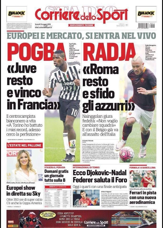 Sul Corriere dello Sport, invece, attenzione focalizzata su due tra i possibili protagonisti di Euro 2016: Paul Pogba e Radja Nainggolan. “Juve resto e vinco in Francia” le parole in prima pagina del centrocampista francese della squadra bianconera; “Roma resto e sfido gli azzurri” il grido di battaglia lanciato dal giocatore belga.