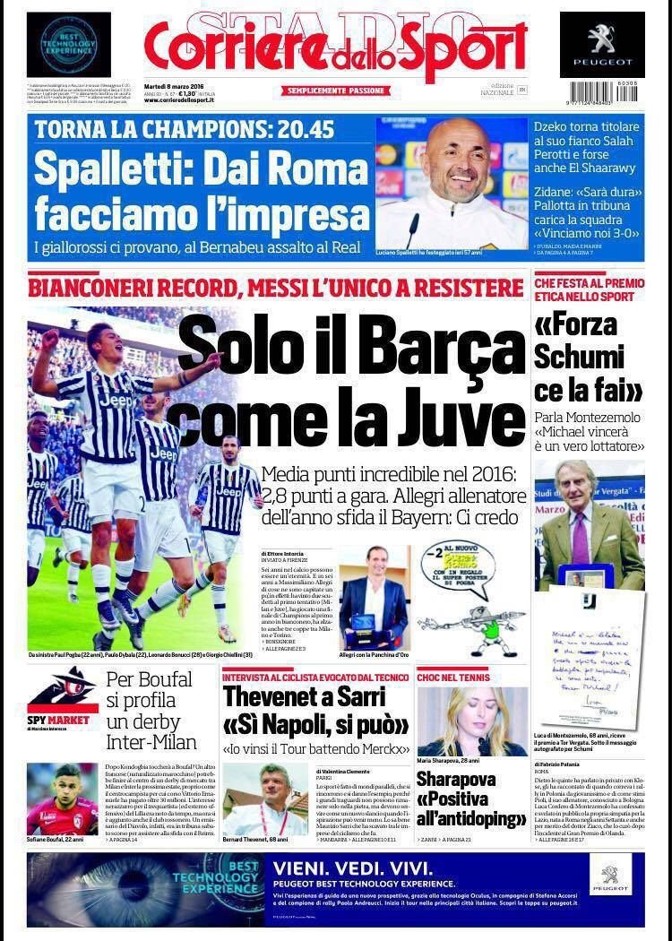 Il Corriere dello Sport titola “Solo il Barça come la Juve“, in riferimento alla mostruosa media-punti nel 2016 degli uomini di Allegri. In taglio alto “Spalletti: dai Roma, facciamo l’impresa“, quindi una ripresa delle dichiarazioni di Luciano Spalletti in vista del match di Champions.