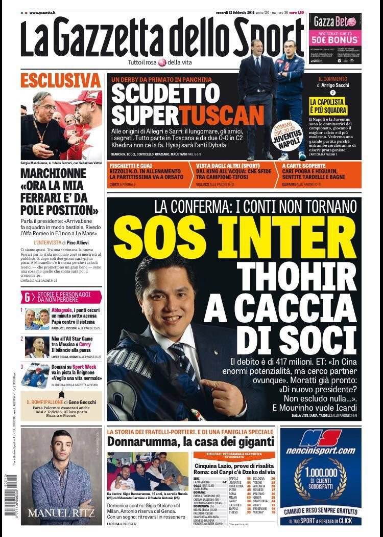 “SOS Inter” è il titolo de La Gazzetta dello Sport. In casa Inter i conti non tornano: il debito è di 417 milioni e il presidente neroazzurro cerca partner ovunque. Massimo Moratti, alla finestra, non esclude un suo ritorno.